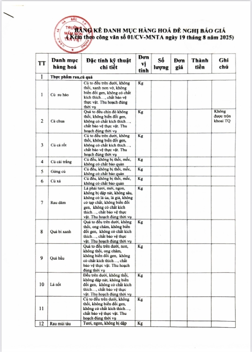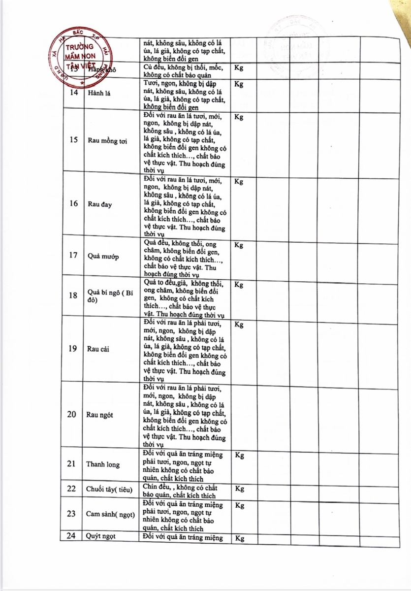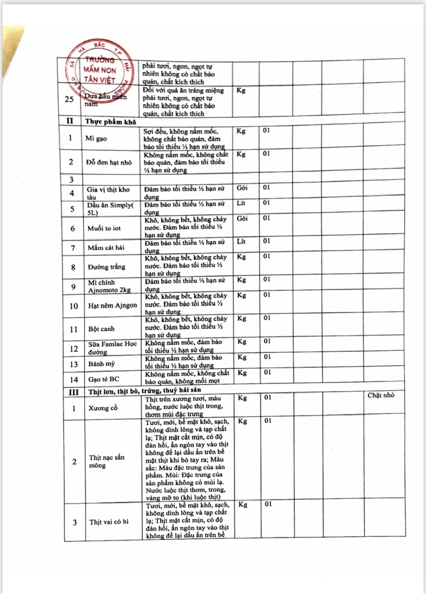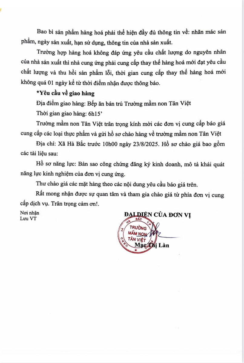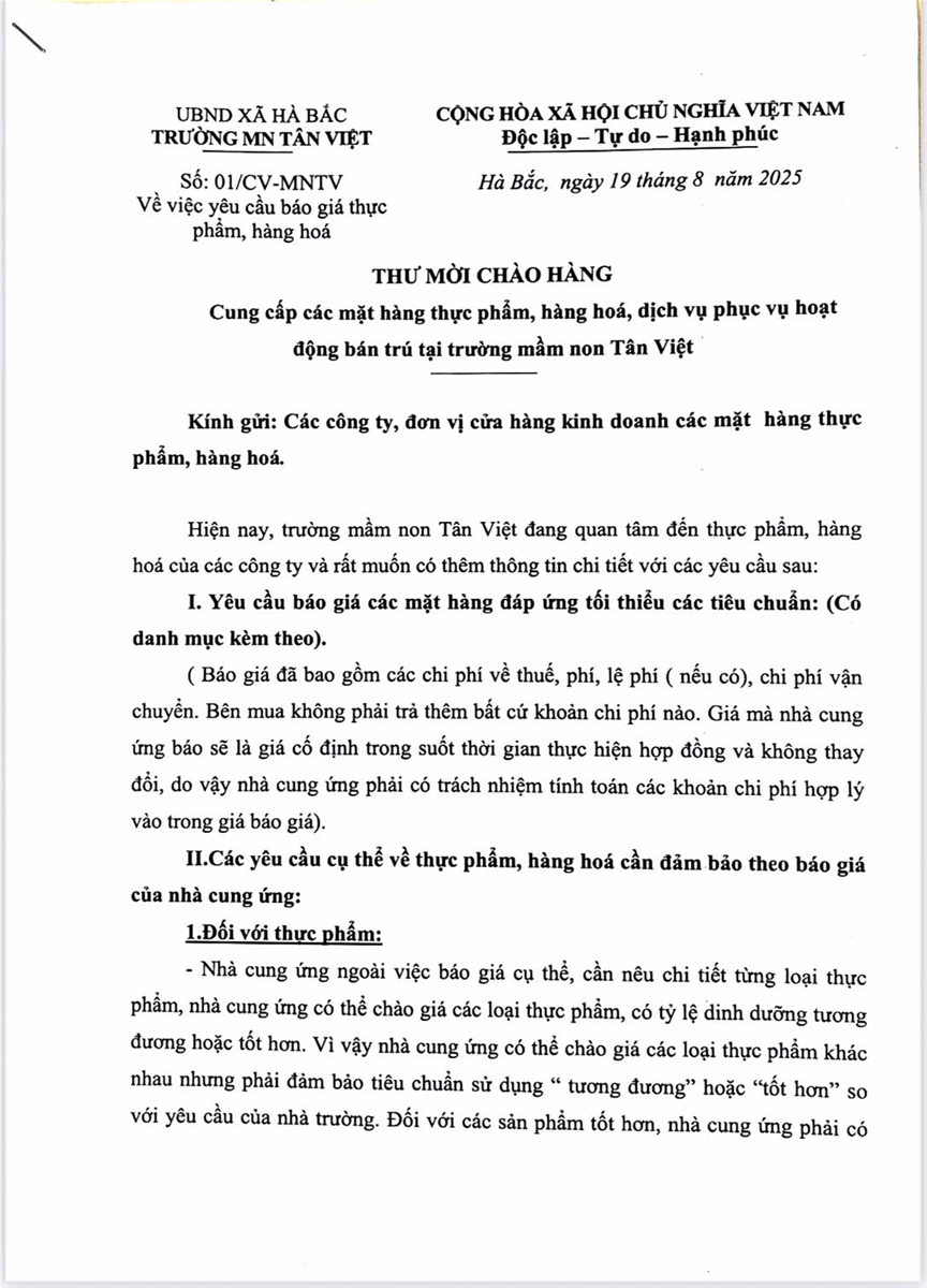 Hiện nay, trường mầm non Tân Việt đang quan tâm đến thực phẩm, hàng hoá của các công ty và rất muốn có thêm thông tin chi tiết ... Cập nhật lúc : 16 giờ 39 phút - Ngày 20 tháng 3 năm 2025